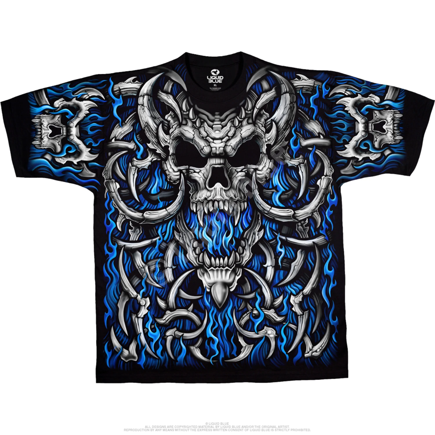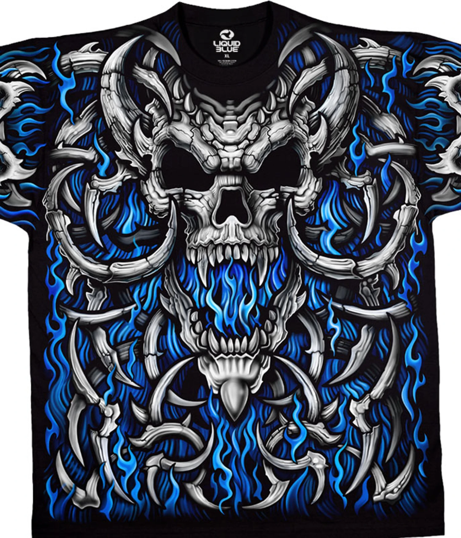 This stunning piece is brimming with all the features synonymous with the Liquid Blue Fantasy line fire, skulls, impending doom, and a wild all-over tie-dye. Blue flame skull is anything but lame or dull.