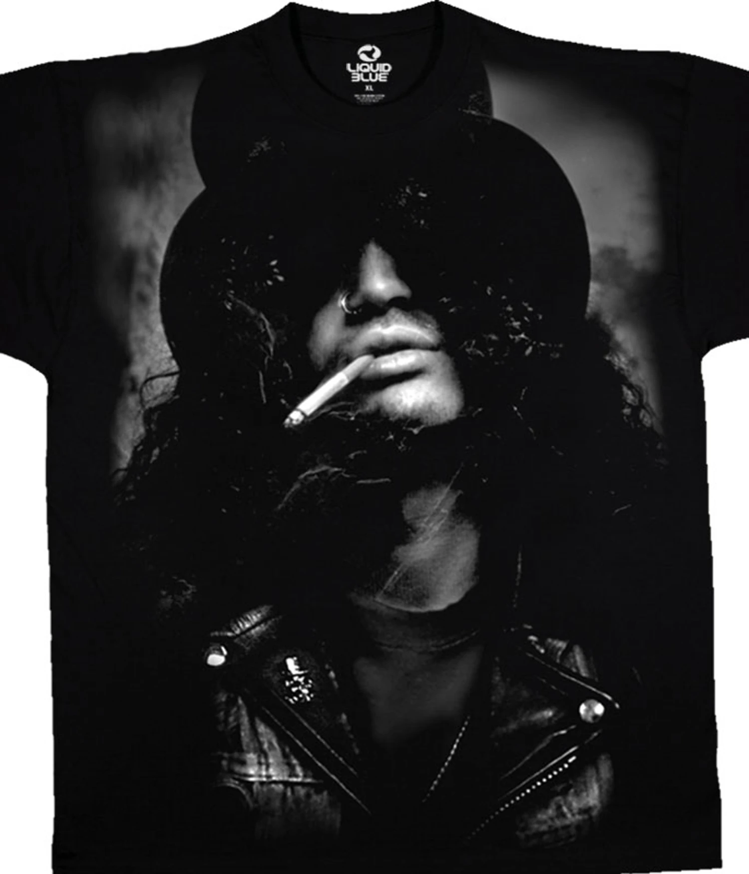 Although most know Slash for his contribution to Guns N’ Roses, he’s also been the driving force behind metal outfits such as Snakepit, Blues Ball, and Velvet Revolver. This Slash T-shirt features a piece of gear almost as recognizable as his Les Paul guitar, his funky top hat. In the pantheon of heavy metal monsters, Slash takes a backseat to no one.