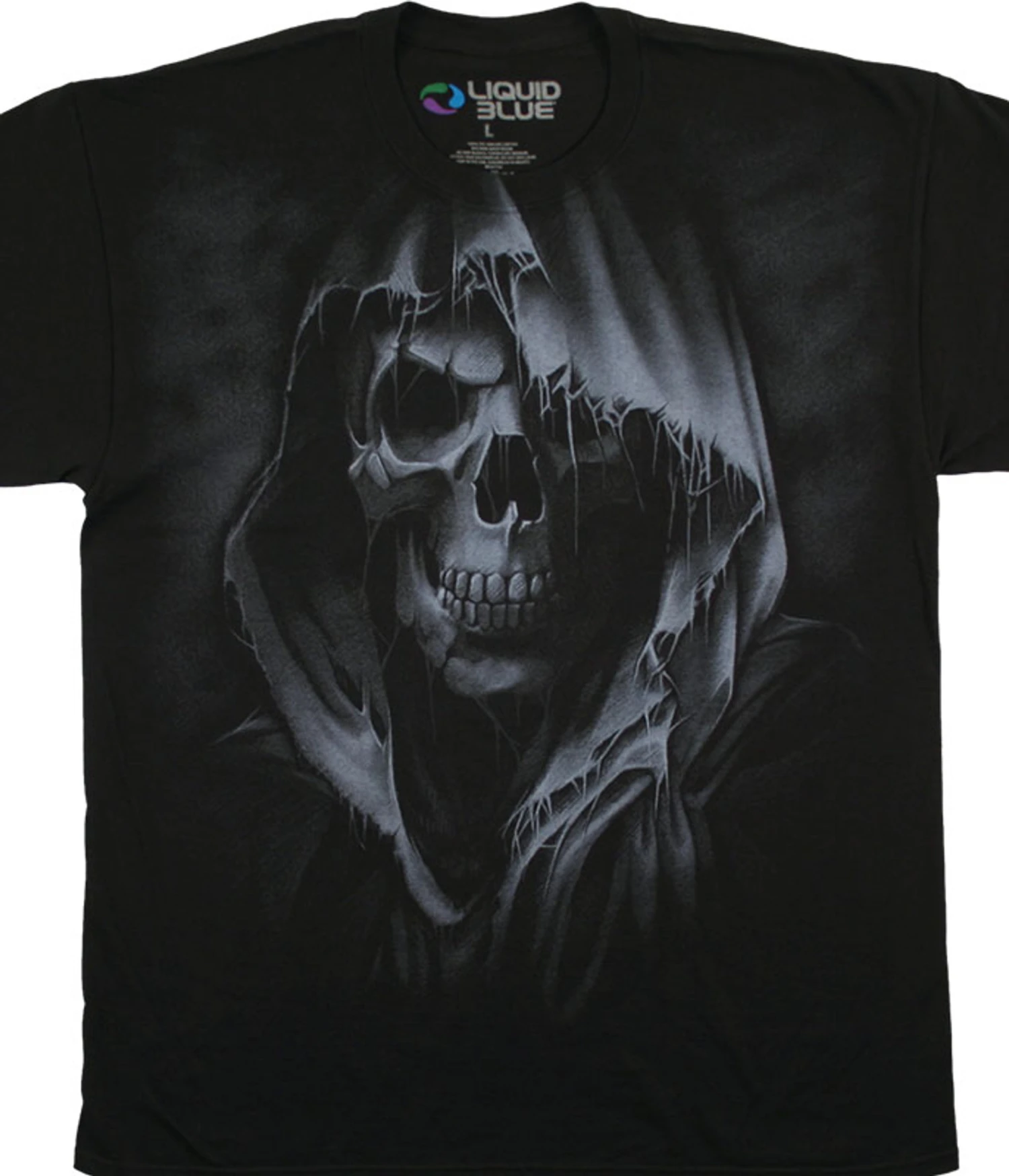 Another dark and deathly t-shirt design from Liquid Blue’s fantasy line. The Reaper waits patiently in the shadows until he once again has to take a soul.